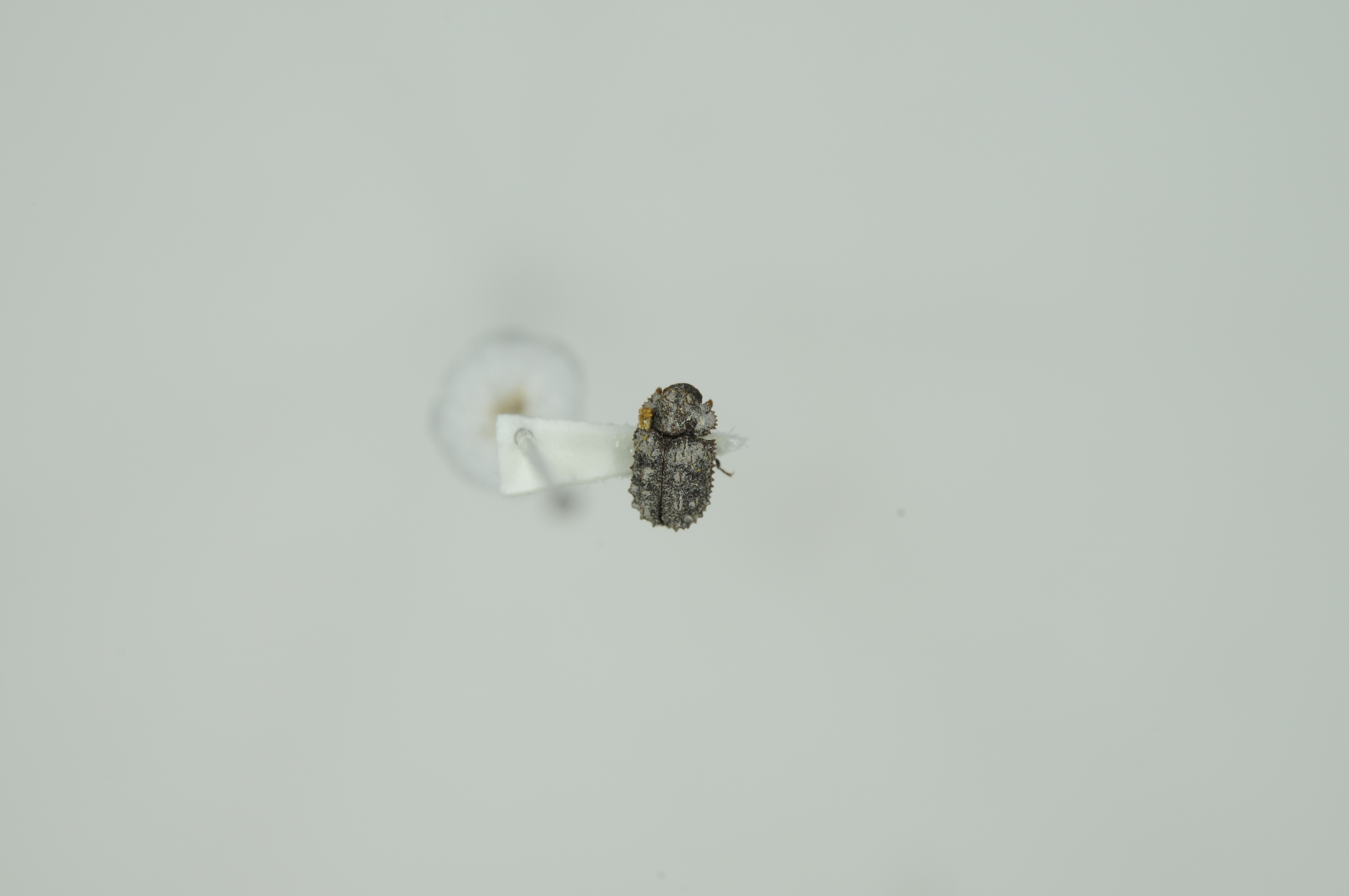 몸길이는 4.2~4.3mm이고, 몸 색깔은 흑갈색이다. 몸의 형태는 장방형~난형이고, 등 면은 매우 볼록하며 흰색의 비늘 돌기로 덮여 있다. 머리는 볼록하고, 주름져 있다. 이마는 주름져 있고 중앙에 얕은 세로홈이 패어 있다. 3번째 더듬이마디는 2번째 마디보다 약 1.6배 길고, 4번째 마디는 원통형에 가깝다. 6번째 마디부터 8번째 마디까지는 삼각형이며 말단 마디로 갈수록 확장된다. 앞가슴등판은 주름져 있고, 거친 점각이 있으며, 돌기가 밀집되어 있으며 한 쌍의 세로 융기와 작은 혹이 있다. 앞가두리는 둥글고 약간 톱니 모양이며, 전연각은 전방으로 돌출되었다. 앞날개는 장방형이고, 기부의 2/3 부분까지는 평행을 이루고, 말단으로 갈수록 점차로 둥글어진다. 등 면은 규칙적이고 거친 점각이 밀집되어 있다. 다리의 넓적다리마디는 적당히 길고 두껍다. 경절은 가늘고 기며, 바깥 면으로 약하게 용골화되었다. 겨울을 제외한 연중, 그러나 주로 봄철, 여름철에 자주 관찰된다. 이 종은 삼색도장버섯, 줄버섯, 메꽃버섯부치에서 서식한다. 한국(강원, 경기), 일본 등에 분포한다. [저작재산권자]