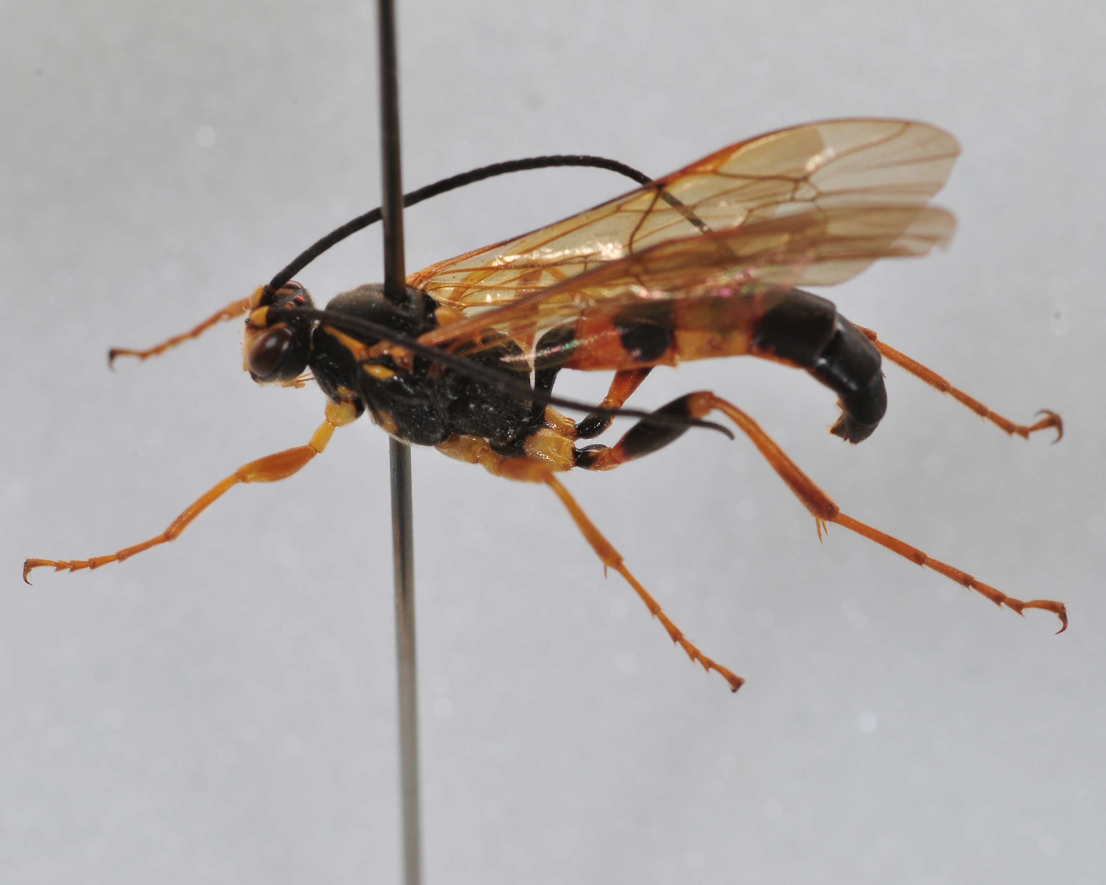 수컷은 흑색이나 제1배마디 기부 반과 제2배마디는 황색이다. 가운데가슴의 등면에는 거친 점각이 있고 제2배마디는 길이보다 다소 넓다. 뒷다리의 밑마디 끝의 반과 앞다리, 가운뎃다리의 넓적다리마디와 뒷다리의 넓적다리마디의 기부와 말단은 황색이며 뒷다리의 종아리마디 끝은 흑색이 아니다. 그 밖의 것은 밑마디흰무늬맵시벌(Diphyus albicoxalis Uchida)과 비슷하다. 기생성, 천적곤충이다. 서울(수락산), 경기도(청계산, 밤섬, 남양주시, 양평, 마석), 강원도(향로봉), 충남(대전), 경남(밀양), 전북(대둔산)에 분포가 확인되었고 한국 고유종이다. [저작재산권자]