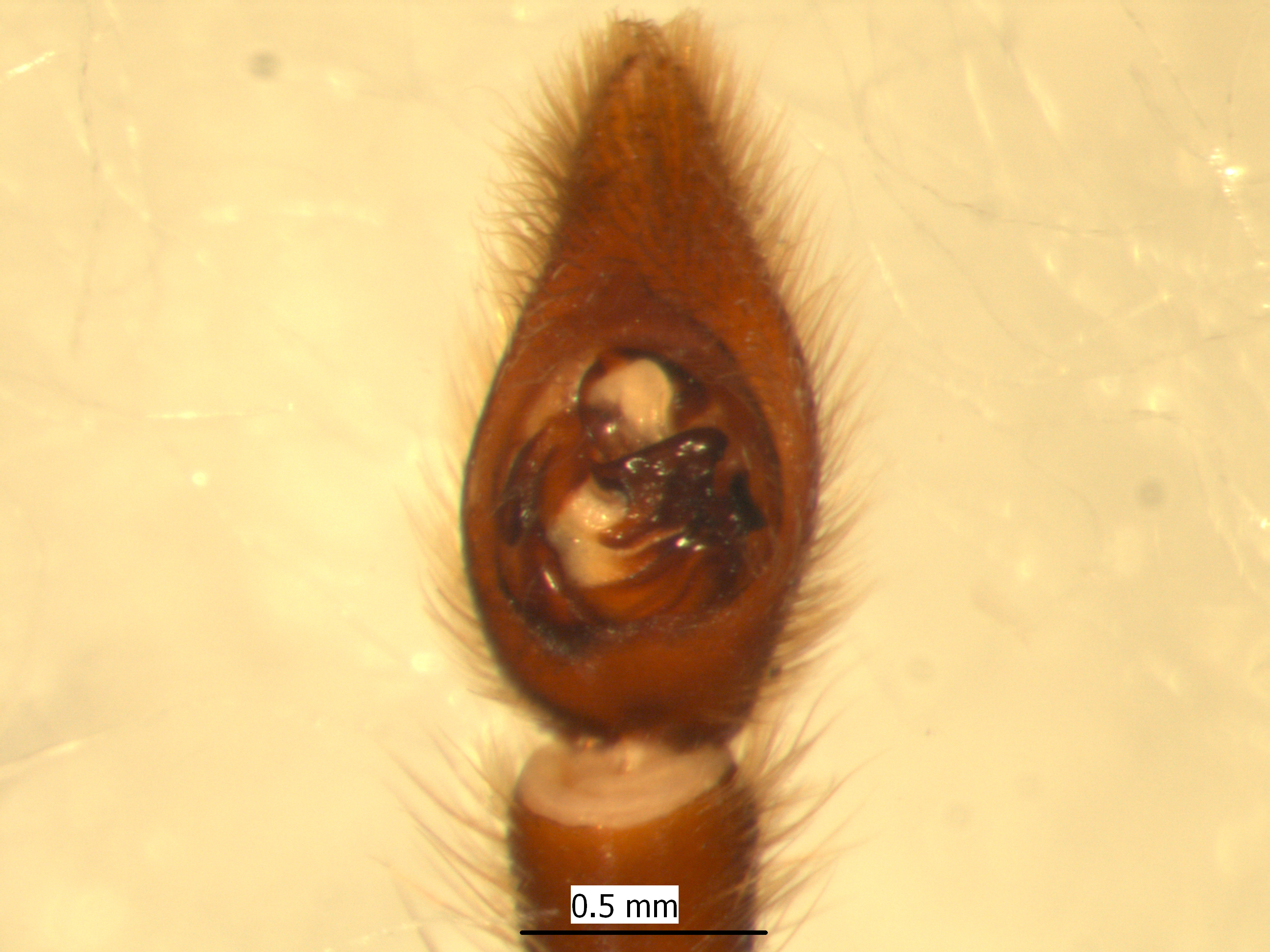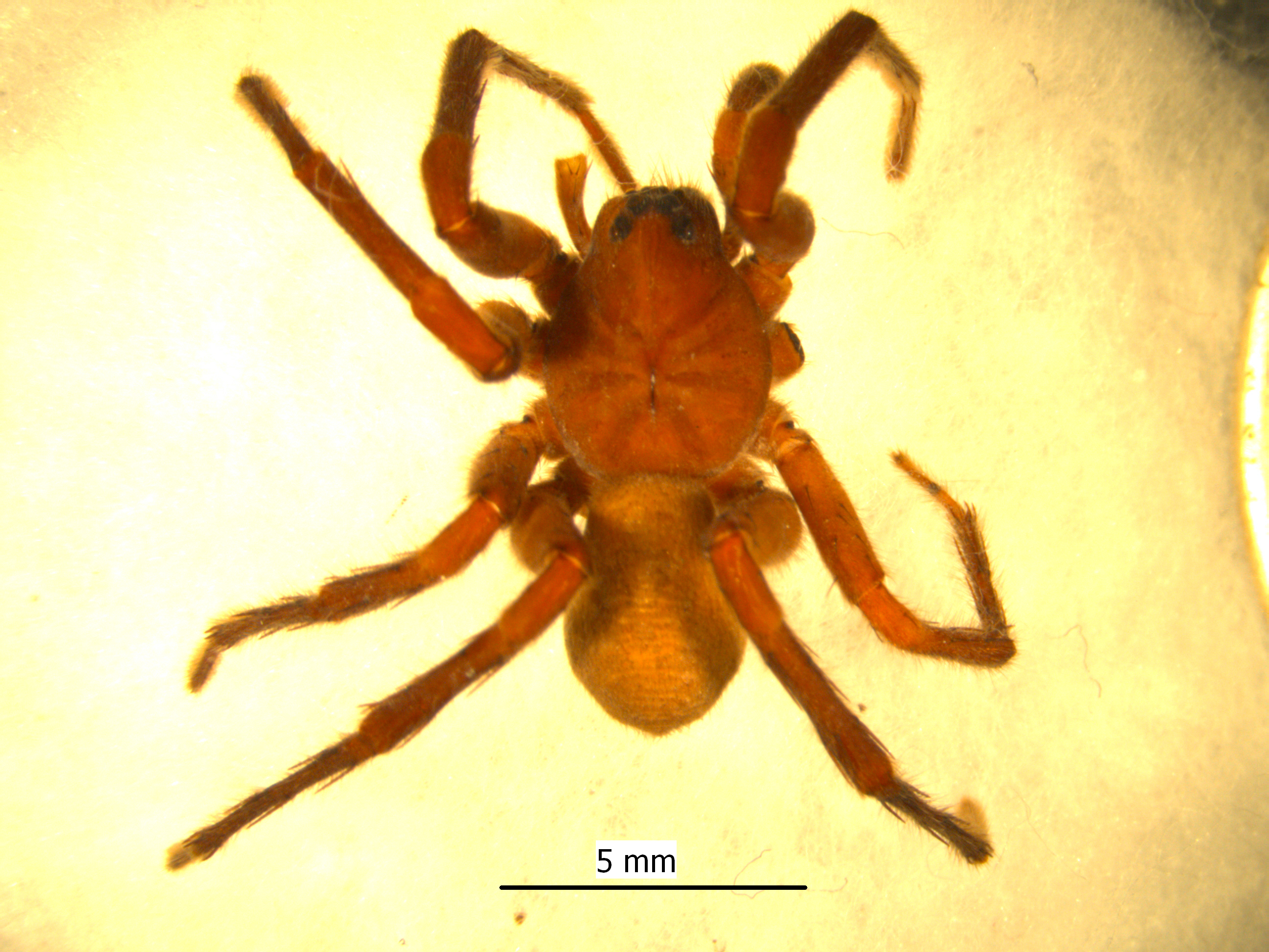몸길이는 암컷이 6.5~7.5mm, 수컷이 5.0~6.0mm다. 배갑은 구형으로 적갈색이다. 가슴홈은 짙은 색의 피침형이고 목홈과 방사홈은 거무스름하다. 눈 구역은 검고 앞눈줄이 약간 전곡한다. 위턱은 암갈색이고 앞엄니두덩니와 뒤엄니두덩니는 각각 3개다. 가슴판은 긴 염통형으로 회황색 바탕에 노란색의 가운뎃줄무늬가 있다. 다리는 황갈색이며 다리식은 4-1-2-3이다. 배는 긴 난형으로 흐린 황갈색이다. 산지의 풀밭을 배회한다. 4~8월에 출현한다. 경남 합천 가야산이 모식산지고 대구 팔공산, 경북 황학산, 영천 은해사, 청송, 포항 보경사 등지에서 채집되었다. 한국 고유종이다. [저작재산권자]