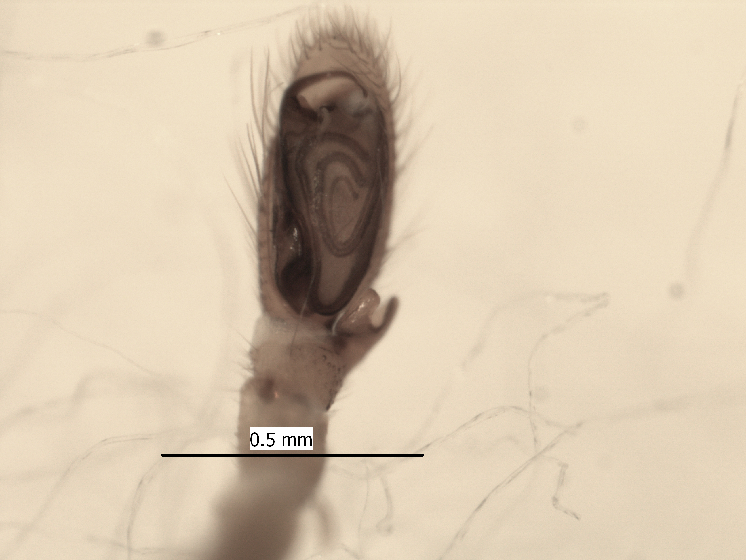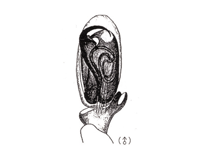 수컷의 머리가슴은 갈색으로 가슴홈은 적갈색이며 폭보다 길이가 길다. 전면에서 보았을 때 양눈줄은 앞으로 굽었고, 위에서 보면, 뒷눈줄은 곧고, 앞눈줄은 뒤로 굽었다. 가운뎃눈네모꼴은 길이보다 폭이 길며 앞보다 뒤가 넓다. 위턱에는 앞두덩니가 7개 정도 있다. 다리는 황갈색이고, 다리식은 4-2-1-3이다. 단자엽 식물의 잎을 말아 산실을 만든다. 새끼가 부화하면 어미는 새끼들에게 자신을 먹이로 제공한다. 경상북도 황학산이 모식산지다. 한국 고유종이다. [저작재산권자]