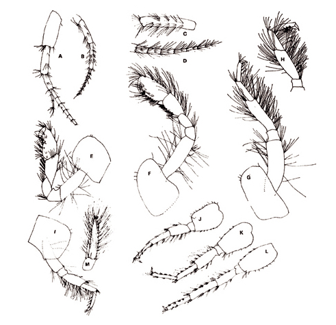 수컷의 몸길이는 8.5mm이다. 제1더듬이의 길이는 몸길이의 반 정도다. 제2더듬이는 가늘고 넷째마디에는 병부의 직경보다 긴 2개의 털뭉치가 있으며 다섯째마디의 안 가장자리에는 6개의 털뭉치가 있다. 채찍마디는 7~9마디로 되어 있다. 제3가슴다리의 나머지 3마디들은 뒤 가장자리에 긴 털을 가지고 있고 넷째마디의 앞 가장자리에 4~6개의 털뭉치를 가지고 있으며 이들의 길이는 병부 직경의 2배보다 길다. 제3꼬리다리의 외지와 내지는 털을 가지고 있으며 내지의 길이는 외지의 1/2~1/3 정도로 짧다. 계곡 하류에 서식한다. 경북 안동에 분포하고 있는 한국 고유종이다. [저작재산권자]
