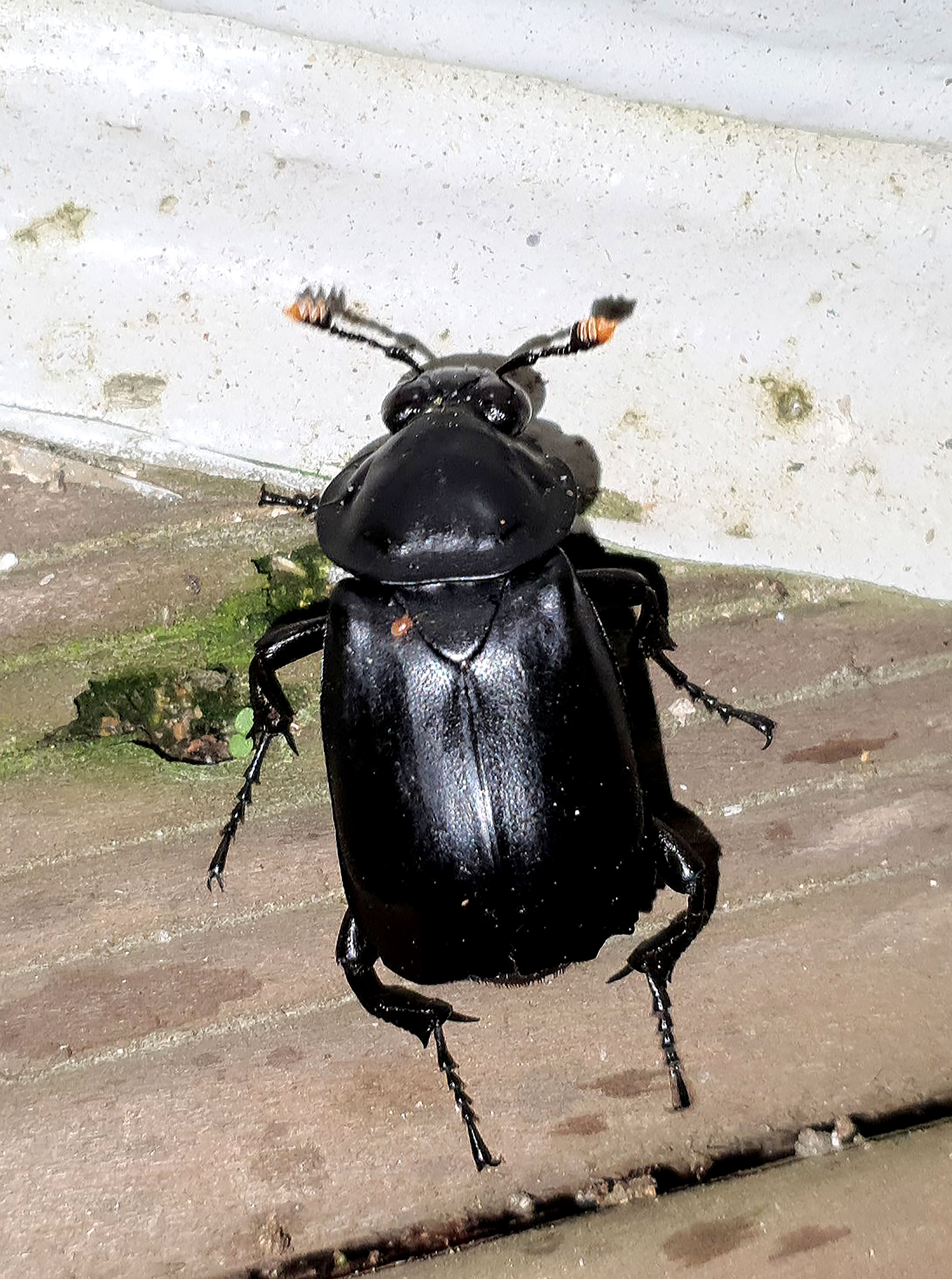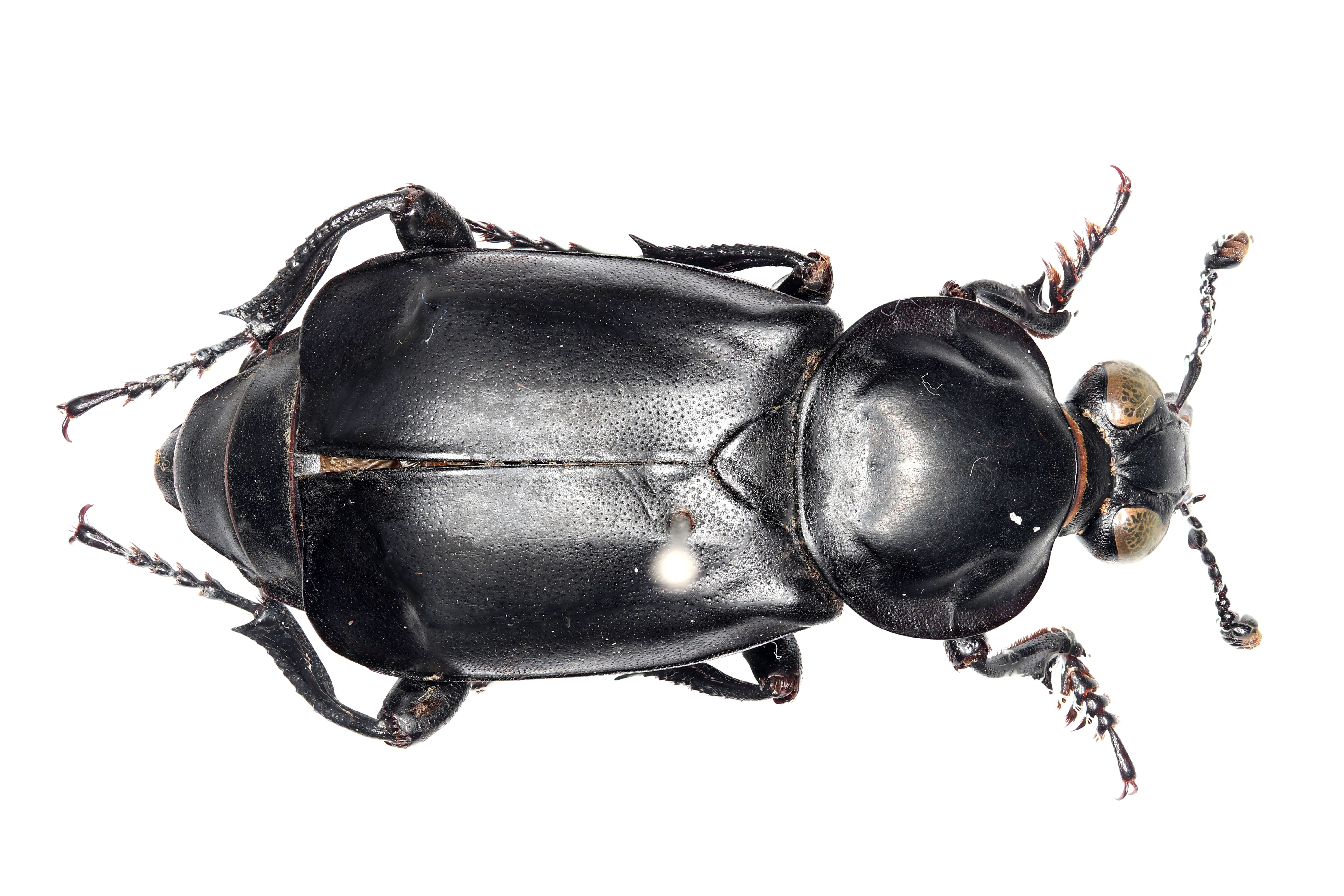 몸 길이 30-40mm. 흑색의 가장 큰 대형 종이며 촉각은 곤봉상으로 말단 3마디는 노란색이다. 윗입술은 흑색으로 중앙이 깊게 함입해 있고 앞 부위에는 황색 털이 나란하게 밀생하고 있다. 이마는 앞쪽으로 3개의 세로 홈줄이 있다. 두순막은 황갈색인데 수컷은 크고 종모양을 하고 있으나 암컷은 삼각형 모양이다. 앞가슴등판은 원반 모양이며 아주 작은 점각이 밀집해 있으며 광택이 있다. 가장자리 면은 수평하며 점각이 중앙보다 조밀하다. 소순판은 크고 작은 점각이 밀집하고 있다. 딱지날개는 작은 점각이 나 있고 날개 끝은 절단상이다. 뒷다리 경절은 약간 안쪽으로 굽어 있다. [저작재산권자]