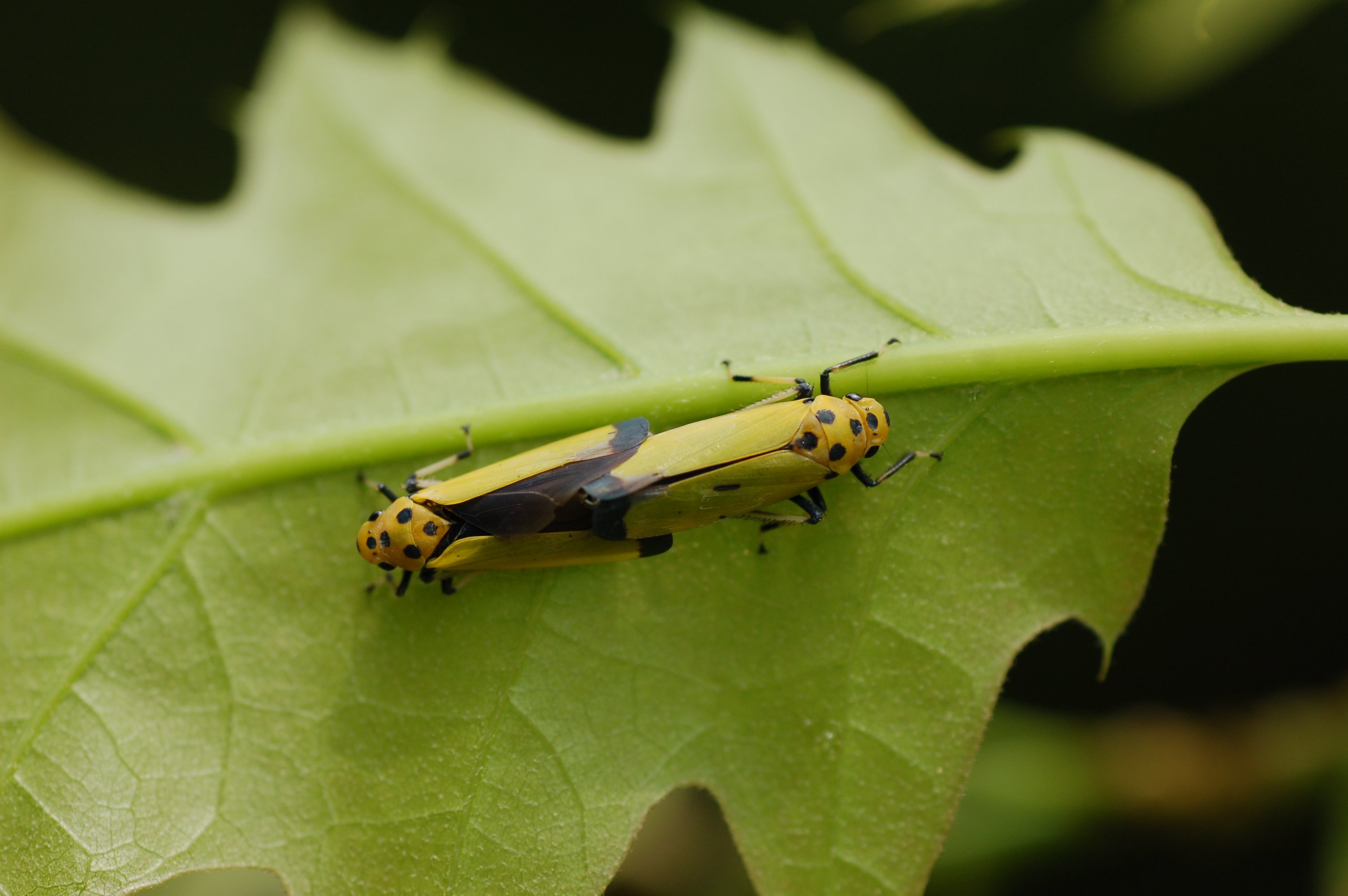 몸길이는 11~13.5mm 내외이다. 몸의 등면은 살아 있을 때 광택을 띤 황록색을 띠지만 죽으면 주황색 또는 등황색으로 변한다. 아랫면과 다리의 기부는 검은색을 띤다. 머리는 현저히 작고 둥글게 돌출해 있는데, 앞가슴등판보다 훨씬 좁다. 정수리의 홑눈 사이, 앞이마 및 얼굴 중앙부에 각각 한 개씩의 둥근 흑색 반점이 있다. 앞가슴등판에는 3개의 검은 점이 삼각형으로 배열한다. 앞날개의 앞쪽 끝부분에는 독특한 검은 띠가 있다. 산림지대에 흔히 분포하며, 산뽕나무나 뽕나무 등에 기생한다. 연 1회 발생하고 월동한다. 성충은 보통 4월 하순부터 활동한다. 한반도 북부, 중부, 남부, 제주도, 울릉도에 나며 일본, 중국, 대만에도 분포한다. [저작재산권자]