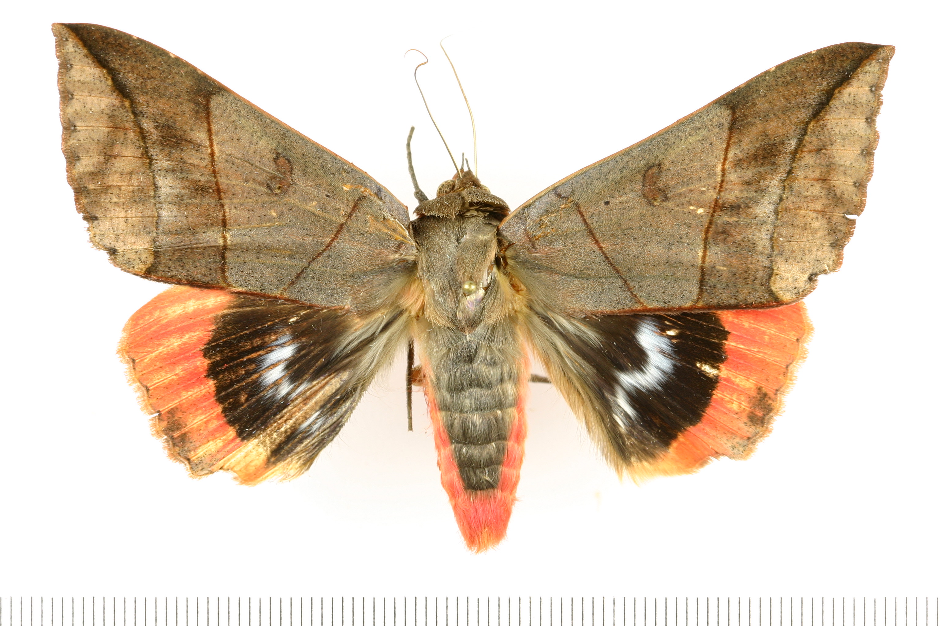 날개 편 길이는 82~90mm이다. 뒷다리의 종아리마디에는 안쪽으로 며느리발톱이 있으며, 기부에는 자침이 있다. 앞날개는 회갈색 바탕인데 아기선, 내횡선, 외횡선, 아외연선 등은 암갈색을 띤다. 가락지 모양 무늬는 1개의 작은 흑색 점 모양이며, 콩팥 모양 무늬는 가는 암색 선으로 테가 둘러져 있다. 외횡선과 아외연선의 사이는 약간 농회갈색이며, 외연은 암색 점렬로 되었다. 뒷날개는 흑색 바탕으로 내부에 S자 모양의 흰색 줄무늬가 있고 외연부는 주홍색 띠를 이룬다. 성충은 6~8월에 출현하며, 주로 열대 지방에 분포되어 있다. 남한 전역에 분포하나 울릉도에서의 기록은 없다. 국외에는 일본, 중국, 대만, 필리핀, 인도네시아, 말레이시아, 인도, 네팔에 분포한다. [저작재산권자]