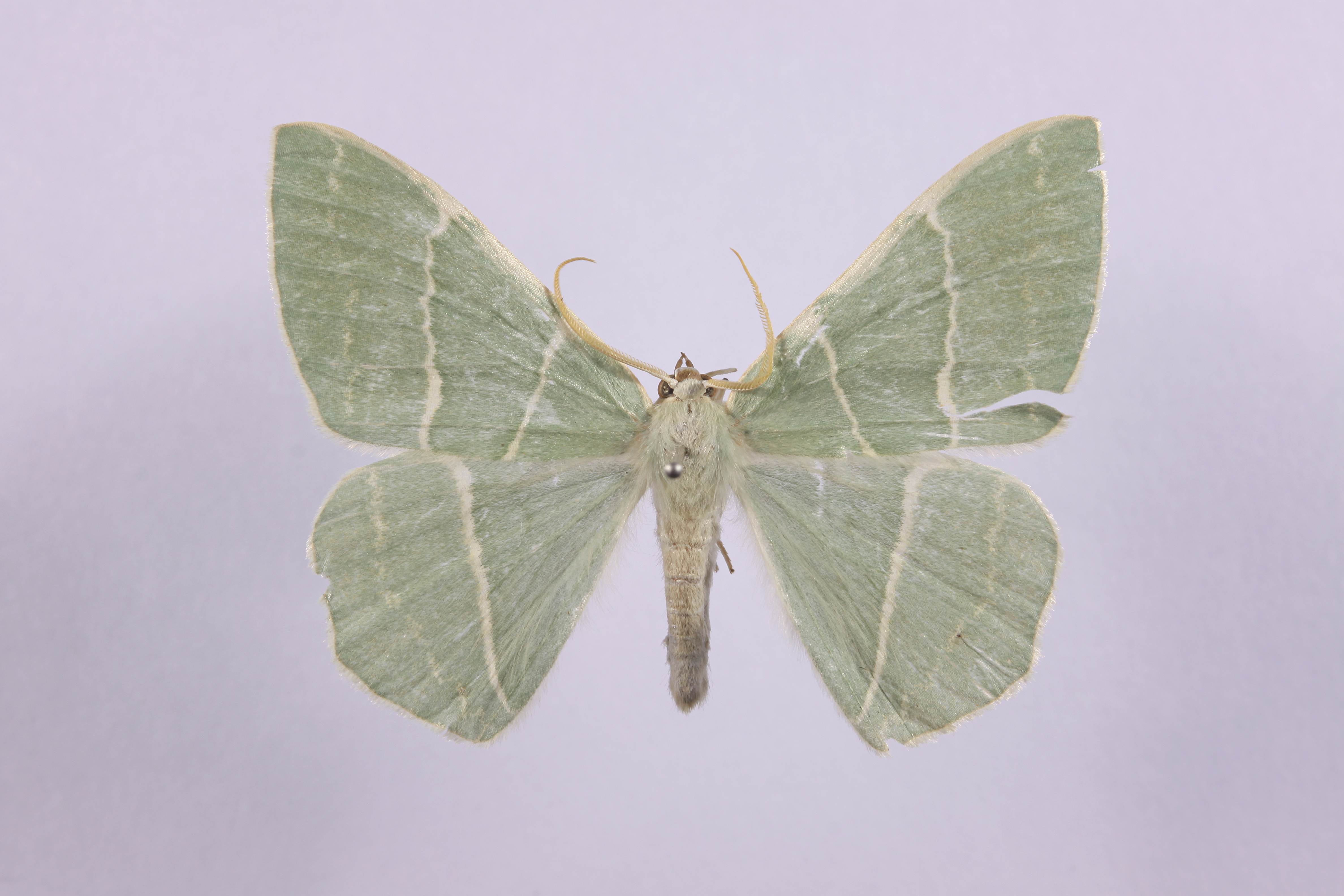 날개편길이 48-52mm이다. 몸과 날개는 모두 녹색이다. 뒷면 앞날개의 후반과 뒷날개는 넓고 백색이다. 더듬이는 수컷이 빗살 모양이고, 암컷은 실 모양이다. 날개는 비교적 세로로 길고, 앞날개 외연은 제3중맥상에서 모서리를 이루지 않으며, 뒷날개에서는 약간 튀어나온다. 내횡선은 일직선으로 경사지며, 외횡선은 앞·뒷날개 모두 수직이나 앞날개에서는 다소 불규칙하게 굴곡하고, 뒷날개에서는 후각 가까이에 이르러 내연 쪽으로 굽는다. 한반도 북부, 중부, 남부, 제주에 분포한다. 국외에는 일본, 중국, 러시아에 분포한다. 성충은 6-8월에 출현한다. 일본에서 유충의 기주식물은 참나무속으로 알려져 있다. [저작재산권자]