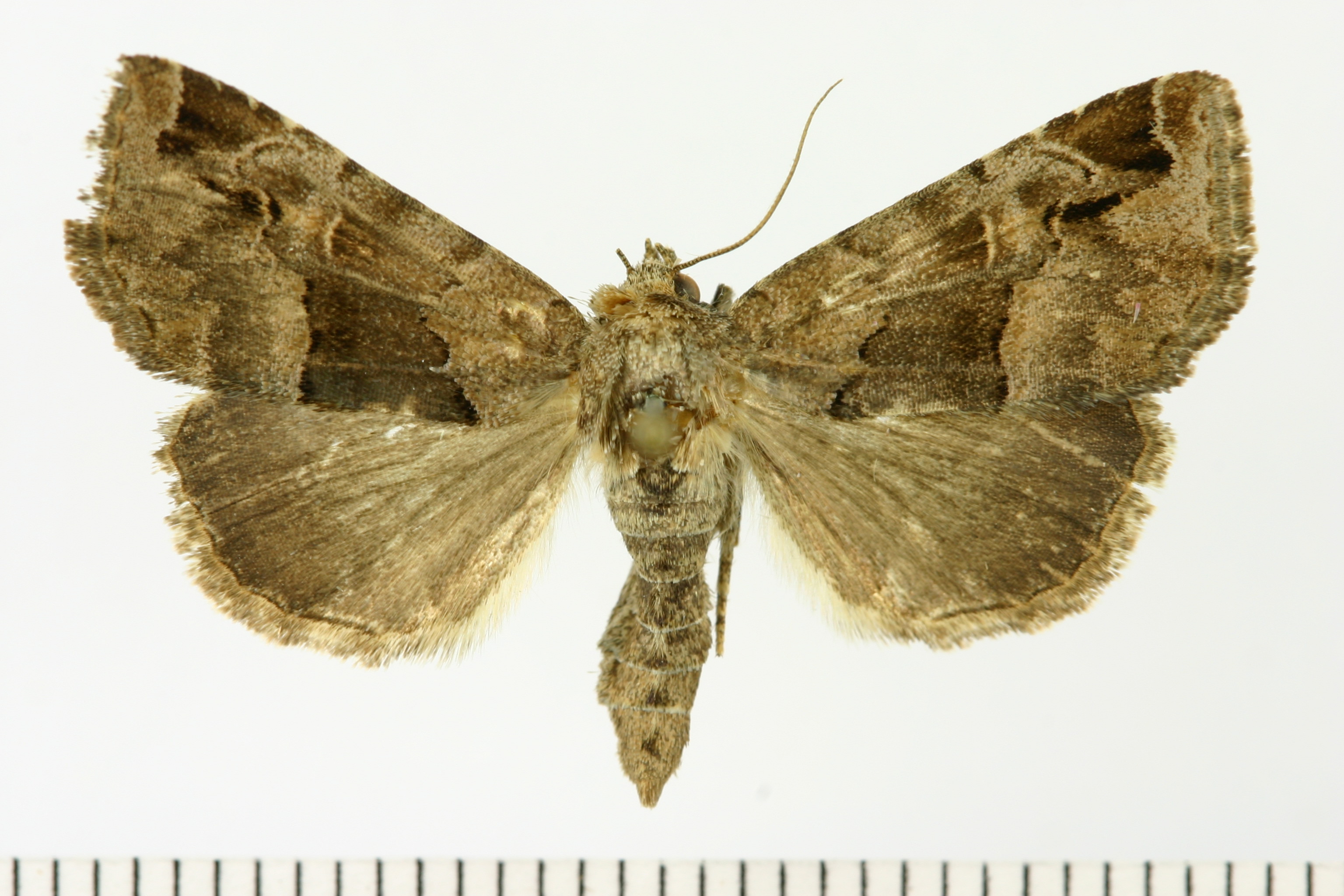 날개편길이 28mm 내외이다. 앞날개는 농회갈색을 띠는데 내횡선과 외횡선의 사이에는 중실의 아래쪽으로 넓게 암색을 띤다. 뒷날개는 농회갈색을 띠며, 외연은 암자갈색을 띤다. 한반도 북부, 중부에 분포하고 있다. 국외에는 일본, 중국, 대만, 극동러시아에 분포한다. 성충은 5~6월과 7~8월에 출현한다. 기주식물은 일본과 중국에서 환삼덩굴로 알려져 있다. [저작재산권자]